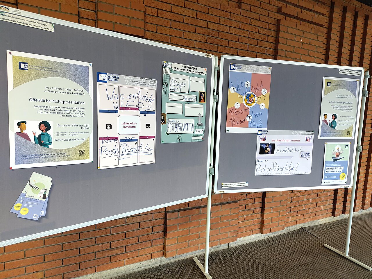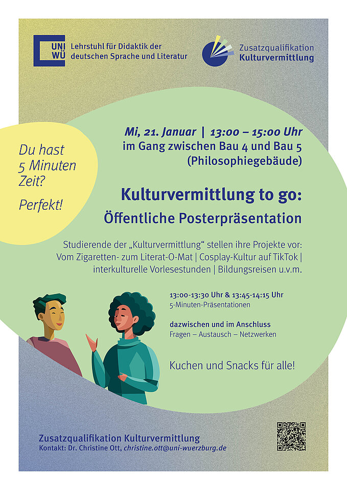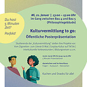 Unter dem Motto "Kulturvermittlung to go" stellen Studierende der Zusatzqualifikation Kulturvermittlung am Mittwoch, 21.01. von 13-15 Uhr ihre Praxiserfahrungen in einer Posterpräsentation vor.