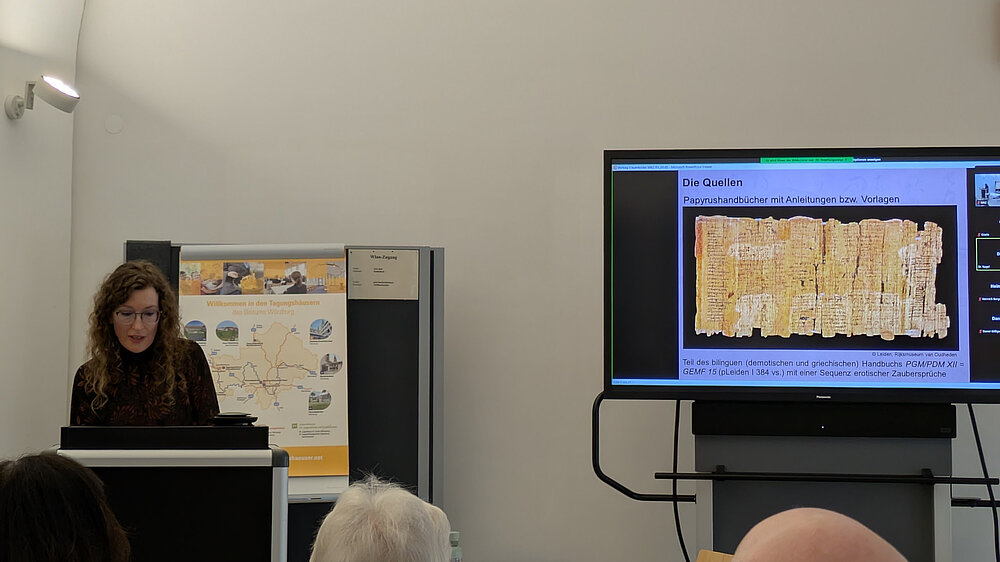 On the evening of May 5, 2025, Dr. Svenja Nagel, post-doc researcher of the MagEIA core team, held a lecture with the title "Frauen(bilder) in den demotischen und griechischen erotischen Zaubersprüchen" as part of the WAZ lecture series "Frauenbilder der Antike" (see: https://www.uni-wuerzburg.de/forschung/waz/aktuelles/ringvorlesungen/). The event was kindly hosted by the Burkardushaus Würzburg.