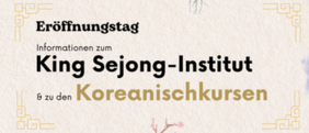 10/16/2024Die Sinologie Würzburg lädt herzlich zur feierlichen Eröffnung des King Sejong-Instituts Würzburg am 18. Oktober 2024 von 11:00-12:30 im Hörsaal 3 (Philosophiegebäude) ein. Es werden die Lehr- und Sprachangebote des King Sejong-Instituts vorgestellt, außerdem gibt es Aufführungen (Taekwando und K-Pop Dance), kostenlose Speisen und Getränke sowie Goodies.