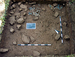 Im Nordteil des umwallten Plateaus wurden drei Sondierungsgrabungen bis auf den anstehenden Fels durchgeführt. Hierbei konnten Erkenntnisse zur Mächtigkeit, Erhaltung, Struktur und Datierung der prähistorischen Kulturschichten gewonnen und eine urnenfelderzeitliche Hangterrassenbebauung nachgewiesen werden. Fläche F hat eine ca. 30 cm mächtige Kulturschicht mit Funden aus dem Jungneolithikum, der Mittelbronzezeit und Urnenfelderzeit erbracht. In Fläche D wurde unter dem Pflughorizont eines mittelalterlichen Wölbackers eine Kulturschicht mit dem Brandschutt eines urnenfelderzeitlichen Hauses angetroffen. In dem untersten Planum fanden sich zahlreiche Pfostenlöcher, die teils in den anstehenden Keuperfels eingeschlagen wurden. In Fläche C wurde eine Hangterrassierung mit dem Begehungshorizont eines späturnenfelderzeitlichen Hauses angetroffen (Abb. 5). Weitere kleinflächige Sondierungen auf einer Bergkuppe im Kunigundenwald erbrachten Nachweise für die Nutzung des Platzes im Mesolithikum und Neolithikum.