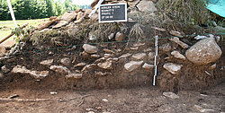 Zwei Schnitte (2 und 20) wurden am Felsfuß der tunnelartigen Halbhöhle angelegt, wobei bis in eine maximale Tiefe von 60 cm prähistorisches Fundmaterial geborgen wurde (Abb. 5). Sichere Befunde konnten im stark zerklüfteten Felsuntergrund nicht registriert werden, hier muss die fein getrennte Verteilung der Funde weitere Informationen erbringen. Neben Geweihbruchstücken eines kapitalen Rothirsches, zahlreichen Tierknochen, Felsgestein-, Sandstein- und Silexgeräten erbrachten diese Schnitte Gefäßfragmente der Bandkeramik, der Schnurkeramik, der Bronze- und Eisenzeit. Da besonders im Süden des Steines (Schnitte 17 und 20) verstärkt unverzierte Grobware des Frühneolithikums auftrat, ist eine temporäre Nutzung des Platzes zu Siedlungszwecken nicht auszuschließen.