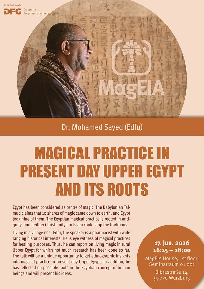 Living in a village near Edfu, the speaker is a pharmacist with wide ranging historical interests. He is eye witness of magical practices for healing purposes. Thus, he can report on living magic in rural Upper Egypt for which not much research has been done so far. The talk will be a unique opportunity to get ethnographic insights into magical practice in present day Upper Egypt. In addition, he has reflected on possible roots in the Egyptian conceptualizations of human beings and will present his ideas.