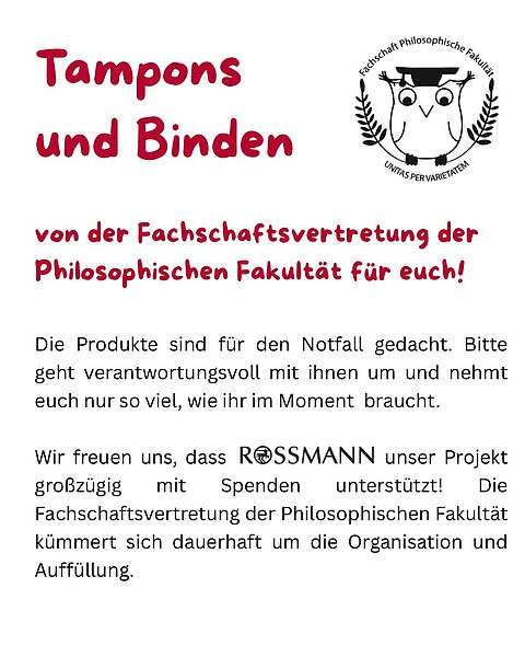 Die Fachschaftsvertretung der Philosophischen Fakultät stellt euch kostenlose Tampons und Binden zur Verfügung!