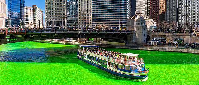Am 17. März ist St. Patrick‘s Day. Menschen mit irischen Wurzeln feiern diesen Tag auf der ganzen Welt, zum Beispiel wie hier in Chicago, wo der Chicago River grün eingefärbt wurde – ein schönes Beispiel für irische Kultur in den USA. (Bild: Thananit / Adobe Stock)