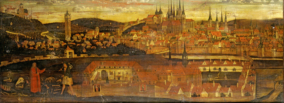 Die thüringische Landeshauptstadt blickt auf eine über 1250jährige Geschichte zurück. Die Gründung des Bistums Erfurt, die bald darauf erfolgte Angliederung an das Erzbistum Mainz, die frühen Stiftungen des Petersklosters und des Schottenklosters, der Bau zahlreicher größerer und kleinerer Kirchen und Kapellen und die Errichtung der Universität waren wichtige Marksteine in der Geschichte Erfurts. Zwar sind etliche Kirchen und Wohnhäuser inzwischen aus dem Stadtbild verschwunden, doch zahlreiche erhaltene Bauten und Baubefunde geben ein dichtes und anschauliches Bild der alten Stadt wieder. So sind nicht nur große Teile der Stadtstrukturen, sondern auch mittelalterliche Bauwerke in vergleichsweise authentischem Zustand erhalten: Brücken, die Synagoge, Reste von wohnturmartigen Steinhäusern, Fachwerkbauten, usw.