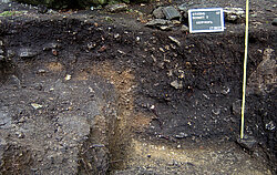 Auf der gegenüber liegenden Westseite des Großen Rothensteins befindet sich ein kleiner, abriartiger Felsvorsprung, der heute eine Fläche von ca. 9 x 2 m schützt (Abb. 3). Eine Sondage von 1,5 x 1,5 m Größe sollte klären, ob sich auch hier Spuren urgeschichtlicher Nutzung erhalten haben. Nach Abgraben einer etwa 50 cm mächtigen Dolomitschuttschicht fand sich mit einer ca. 10 cm starken, holzkohlehaltigen Schicht ein erstes Begehungsniveau, dessen Fundmaterial der Römischen Kaiserzeit und der Spätlatènezeit angehörte. Wiederum durch eine sterile Schuttschicht von etwa 20 cm getrennt, ließ sich darunter ein ca. 10 cm mächtiger, hallstatt- bis frühlatènezeitlicher Nutzungshorizont aufdecken, von dem sich eine ca. 1,2 m lange und 0,4 m tiefe Grube in ein weiteres Schuttpaket einschnitt (Abb. 4). Da der Sondageschnitt die Grube nicht vollständig erfasste, kann die Breitenausdehnung erst in einer für 2008 geplanten, großflächigeren Untersuchung festgestellt werden. Interessant ist der Inhalt der Grube, der aus einer unvollständigen, umgestülpten Schüssel der Frühlatènezeit, vielen Einzelscherben unterschiedlicher Gefäße der Hallstatt- und Frühlatènezeit, einem großen Mahlsteinbruchstück aus Quarzit, einem eiförmigen Klopfstein aus Kalkstein, einem weiteren, klopfsteinartigen Artefaktfragment aus einem Flussgeröll und einer größeren Anzahl von Tierknochen bestand (Abb. 5). Alles war mit einem fast 1 m langen Dolomitstein überdeckt.