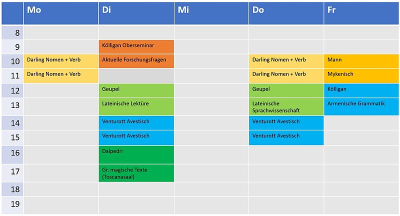 | Einführung in die indogermanische Grammatik 2: Das Verb | Dr. Mark Darling | Do. 10–12 | Ü |