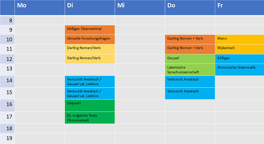 | Einführung in die indogermanische Grammatik 2: Das Verb | Dr. Mark Darling | Do. 10–12 | Ü |